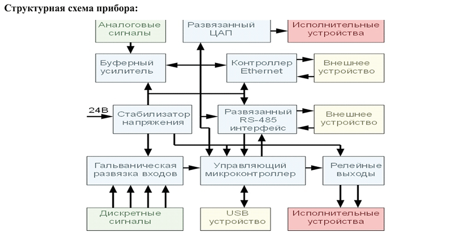 Прибор состоит из стабилизатора напряжения, управляющего микроконтроллера, изоляторов входных дискретных сигналов, гальванически развязанного интерфейса RS-485, гальванически развязанного цифроаналогового преобразователя, аналогового буфера, контроллера Ethernet и исполнительных электромагнитных реле.
